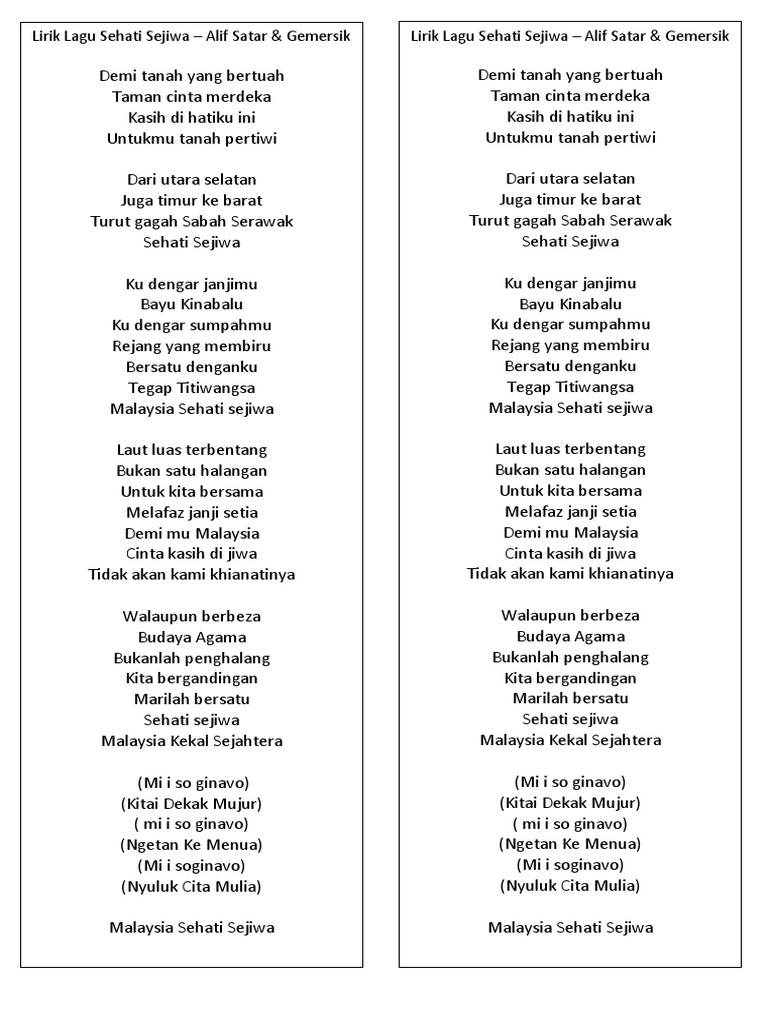 Lirik Lagu Hari Kebangsaan 2015 Sehati Sejiwa