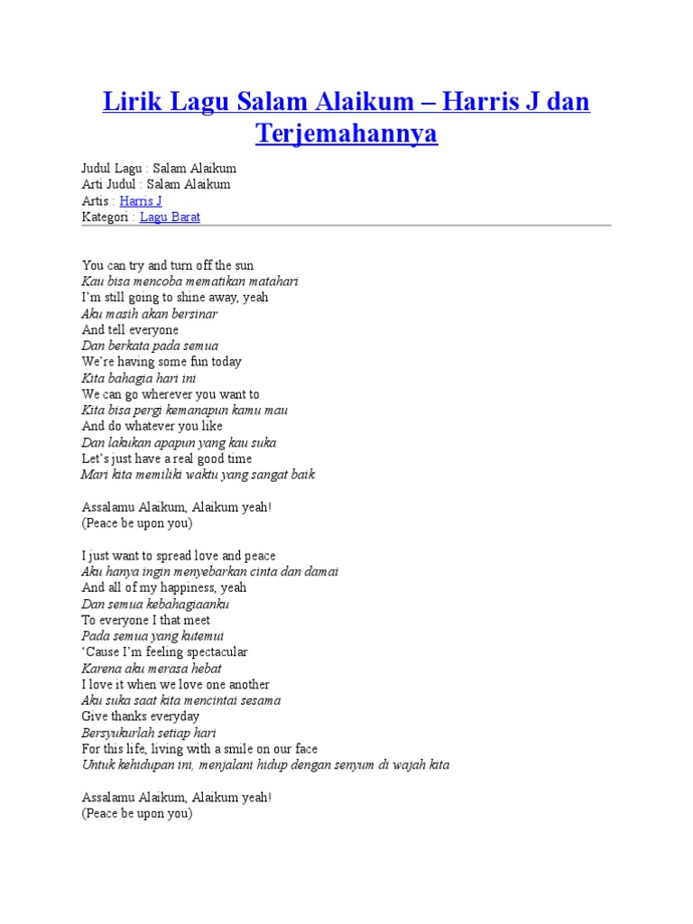 Lirik Lagu Salam Alaikum Harris J Dan Terjemahannya