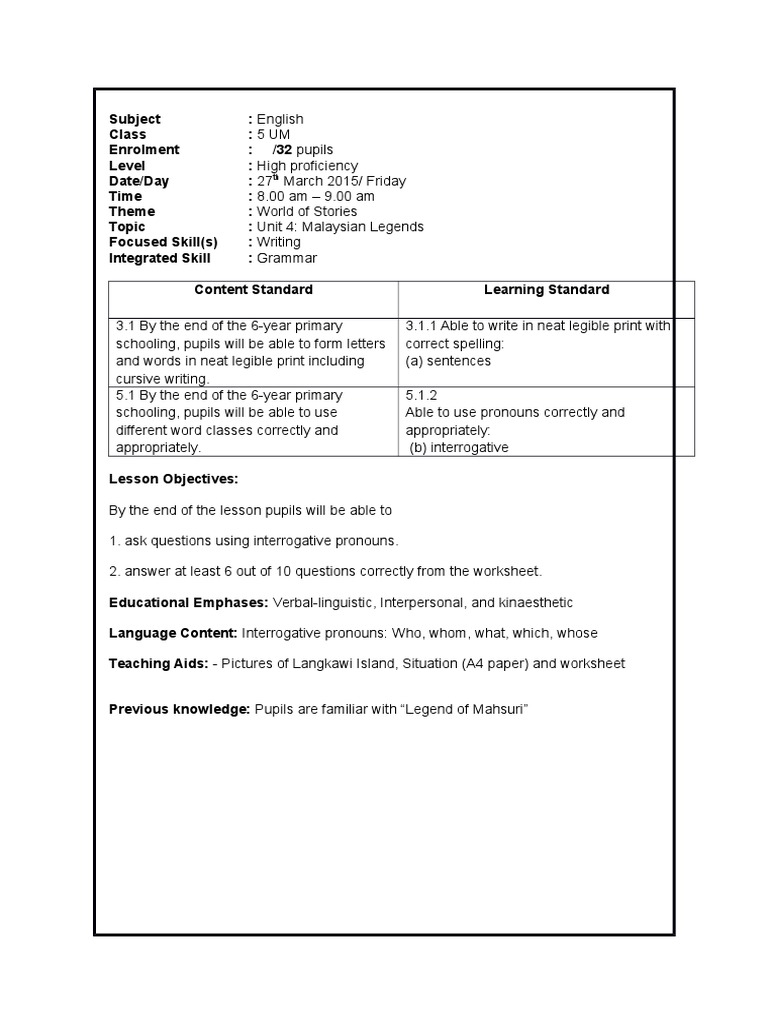 Lesson Plan Year 5 Grammar Malaysian Legends Linguistics