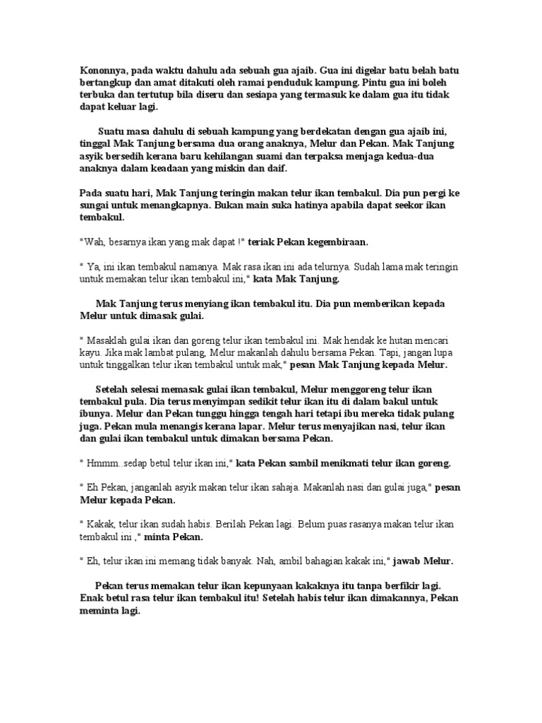 Pekan batu belah batu bertangkup. Kisah batu belah batu bertangkup sudah sering saya dengar sejak saya masih kecil dan cerita ini merupakan sebuah kisah lagenda yang terkenal buat masyarakat melayu yang berarti batu yang bisa terbuka dan tertutup terbelah dan kemudian bersatu kembali. Batu batangkup adalah hormati dan sayangi kedua orang tuamu karena kesuksesan dan kebahagianmu dimasa depan akan sangat tergantung dari doa mereka. Melur dan pekan becacak untok magek mak tanjung. Sebaik sahaja mak tanjung melangkah masuk pintu gua ajaib itu pun tertutup.